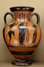 | Keywords: Neck amphora Dionysos Louvre F36bis.jpg Exekias potter Towry Whyte Painter Dionysos a silenus and a maenad Attic black-figure neck-amphora ca 540 “530 BC Dionysos silène et mĂ©nade Amphore Ă col attique Ă figures noires vers 540-530 av J -C H 33 5 cm 13 in Diam 23 7 cm 9 ÂĽ in Museum Louvre Department of Greek Etruscan and Roman antiquities in the Louvre Sully first floor room 42 Beazley ABV 142 8 object history credit line Campana Collection 1861 accession number F 36 bis Jastrow 2006 other versions 540s BC pottery in France Paris 530s BC pottery in France Paris Dionysos with Sileni in ancient Greek pottery Dancing Sileni in ancient Greek pottery Exekias Towry Whyte Painter Ancient Greek Neck amphoras Greek antiquities in the Louvre - Room 42 Maenads in ancient Greek pottery Vases from the Campana Collection |