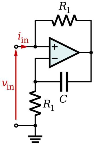 | Keywords: Negative impedance converter - negative inductance.svg A negative impedance converter producing a negative inductance <math>Z_ in \frac v_ in i_ in -j \omega C R_1 2</math> own 2009-12-06 Inductiveload Own work all rights released Public domain Negative impedance converters |