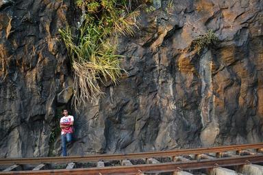 Keywords: negative space boy pose scene artist rail road rail rails train transport path tunnel sri lanka ceylon mawanella kadugannawa