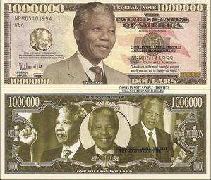 | Keywords: Nelson Mandela 1M banknote.jpg 1 000 000 US banknote with Nelson Mandela Billet de banque de 1 000 000 de dollars US avec Nelson Mandela http //images-01 delcampe-static net/img_large/auction/000/225/756/963_001 jpg 2013 US Federal Reserve Bank PD-USGov Nelson Mandela on banknotes Banknotes of the United States Banknotes with a face value of 1000000 |