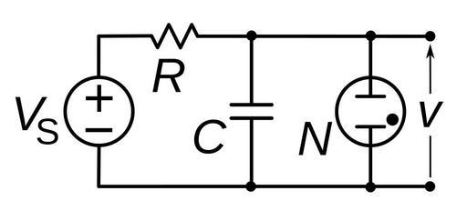 | Keywords: Neon bulb oscillator circuit.svg Pearson-Anson oscillator a very simple type of relaxation oscillator which uses a neon bulb N as a switching device with hysteresis The voltage source V<sub>S</sub> charges capacitor C through resistor R The neon bulb has a very high resistance until the capacitor voltage reaches its breakdown voltage V<sub>br</sub> at which it conducts and discharges the capacitor and the cycle repeats it Semplice circuito di un Oscillatore RC a Rilassamento utilizzante una lampada al neon come dispositivo non lineare 2014-04-14 12 44 27 own Chetvorno cc-zero Uploaded with UploadWizard Astable circuits |