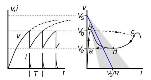 | Keywords: Neon bulb relaxation oscillator hysteresis curve.svg characteristic curve of a neon bulb relaxation oscillator right showing the hysteresis loop abcd of the oscillation and the resulting voltage and current waveforms left A neon bulb relaxation oscillator consists of a capacitor which is charged from a voltage source V<sub>0</sub> through a resistor R with a neon bulb across the capacitor which discharges it once it reaches the bulb's breakdown voltage V<sub>b</sub> Ths hysteresis curve abcd shows the detailed cycle a-b The voltage across the bulb rises slowly from zero as the capacitor charges through a to b where it reaches the breakdown voltage V<sub>b</sub> of the bulb The gas in the bulb ionizes and it become conductive b-c The charge from the capacitor begins to flow through the bulb instantly increasing the current to point b in the abnormal glow region of the curve The bulb turns on c-d The voltage across the bulb and capacitor drops quickly to the extinguishing voltage V<sub>e</sub> at which the voltage is insufficient to continue ionizing the gas The bulb turns off d-a The current through the bulb drops to a very low level allowing the current from the resistor R to begin charging the capacitor up again from a to b and the cycle repeats The circuit generates a sawtooth wave left alternating between V<sub>e</sub> and V<sub>b</sub> The blue line is the load line with a slope equal to the resistor R In order for the circuit to oscillate the load line must intersect the IV curve in it's negative resistance region shaded region the segment from b to d where it is declining to the right If the resistor is too large value so the load line intersects the curve in section a-b the resistor current will be so low that the bulb leakage current will bleed the capacitor charge away and the voltage will never reach V<sub>b</sub> If the resistor is too small so the load line intersects the curve in section c-d the current through the resistor will be large enough to keep the bulb turned on and it won't reach the extinguishing voltage V<sub>e</sub> Information from http //www introni it/pdf/GE 20Glow 20Lamp 20Manual pdf C R Daugherty et al General Electric Glow Lamp Manual 2nd Ed General Electric Cleveland Ohio 1966 2014-03-29 13 08 13 own Chetvorno Neon bulb relaxation oscillator hysteresis curve 2 svg cc-zero Uploaded with UploadWizard Relaxation oscillators Device current-voltage characteristics Negative resistance |