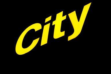Keywords: neon sign shield city yellow light rays shine advertising sign advertisement lettering
