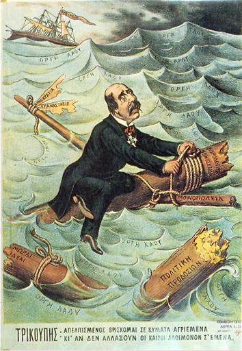 | Keywords: Neos Aristofanis4.jpg en Greek satirical poster of 1893 depicting Charilaos Trikoupis el Γελοιογραφία του ' έου Αριστοφάνη' στην ο οία ο Τρικού ης νίγεται μέσα στη θάλασσα της λαϊκής οργής την τρικυμισμένη α ό την κυβερνητική ολιτική δανείων και φόρων Ιστορία του Ελληνικού Έθνους Εκδοτική Αθηνών Αθήνα 1978 ISBN 960-213-110-1 σελ 40 author 1893 δείτε αρακάτω PD-old Greece in the 19th century Charilaos Trikoupis Political cartoons of Greece | ||||