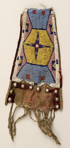 | Keywords: NEPE Beadwork.jpg en Decorative Panel Plateau This is a decorative panel from either the pommel or cantle of a woman ™s saddle This ˜drop ™ is rawhide with lazy stitched glass seed beads and red wool trade cloth edging silver buttons or conchos and rawhide fringe decorate the bottom It represents an early style of beading and typical Columbia Plateau color pallet Rawhide glass cloth silk L26 0 W 15 0 cm Nez Perce National Historical Park NEPE 1982 Nez Perce National Historical Park NEPE 1982 Nez Perce National Historical Park 18 PD-USGov Nez Perce Native American beaded bags and pouches Columbia Plateau w Native American objects of Columbia Plateau |