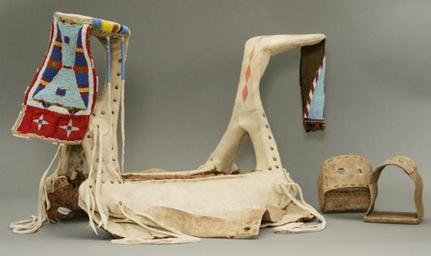 | Keywords: NEPE Saddle Woman.jpg en Woman ™s Saddle c 1870-1880s Horses were reintroduced to North America by the Spaniards Many of the horse accoutrements such as this saddle reflect the Spanish roots of the horse The two high projections at the front and back of the saddle are reminiscent of Spanish designs The tree of this women ™s saddle is made from elk antler pieces and wood Rawhide was then stretched over the frame that in turn was covered with brain-tanned buckskin The fenders are bison hide Some of this saddle was made in the 1870s or 80s It was remade in the 1950s adding newer elements to the old The stirrups are made of rawhide with wood footholds Paint tacks wool trade cloth and glass trade beads complete the decorative elements Elk antler Cervus elaphus bison hide Bos bison buckskin H 43 4 W 30 L 72 cm Nez Perce National Historical Park NEPE 8896 Nez Perce National Historical Park NEPE 8896 Nez Perce National Historical Park 1870-1880 PD-USGov Nez Perce Saddles |