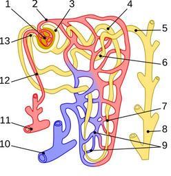 | Keywords: Nephron illustration.svg en A modern illustration of the basic physiology of a nephron within a kidney 2012-06-16 own Burton Radons The labels are 1 Glomerulus 2 Efferent arteriole 3 Bowman's capsule 4 Proximal tube 5 Cortical collecting tube 6 Distal tube 7 Loop of Henle 8 Collecting duct 9 Peritubular capillaries 10 Arcuate vein 11 Arcuate artery 12 Afferent arteriole 13 Juxtaglomerular apparatus cc-zero Uploaded with UploadWizard SVG files on nephron | ||||