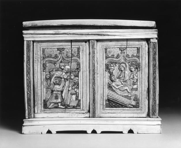 | Keywords: Netherlandish - Casket with Scenes from the Passion of Christ - Walters 71251 - Right.jpg This type of large rectangular box elaborately decorated with scenes depicting either the Passion of Christ or the Life of the Virgin was produced in great quantity in 15th-century Flanders The artist drew inspiration from contemporary woodcuts particularly the Bible of the Poor Biblia Pauperum a pictorial Bible for the illiterate first produced ca 1430 This example depicts Christ's Passion The scenes of Christ's Arrest his Carrying of the Cross Entombment Harrowing of Hell Resurrection and Appearance to Mary Magdalene have all been taken from this source The carved panels retain much of their original paint and gilding The gilded bronze lock plate on top is a 17th-century addition ca 1450 Late Medieval ivory gilt bronze paint cm 16 1 31 5 19 4 accession number 71 251 39550 Count Girolamo Possenti Fabriano Sale Raphael Dura Florence April 1 1880 no 38 F Ongania Venice Henry Walters Baltimore by purchase Walters Art Museum Henry Walters Acquired by Henry Walters place of origin Flanders Walters Art Museum license Medieval art in the Walters Art Museum Renaissance applied arts in the Walters Art Museum Art of the Netherlands Media contributed by the Walters Art Museum needs category review Biblia pauperum |