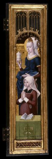 | Keywords: Netherlandish - Triptych with Lamentation Over Christ with Donors and Saints - Walters 37242 - Front Right.jpg This altarpiece was probably made for the family chapel of the couple portrayed on the wings The elegantly carved central scene of the mourning over the dead Christ is set into a niche as if in a church After the central scene was carved painted and gilded probably in Brussels the unfinished triptych would have been sent to the shop of a painter The style suggests that he was influenced by Hugo van der Goes active ca 1440-1482 and probably worked in Ghent There the wings were finished with commissioned portraits The wings show the donors kneeling in prayer accompanied by their patron saints John the Baptist and Mary Magdalene The linked initials I and M are surely those of the donors' first names Jan I and J were written the same and Maria which we can guess from their patron saints but their family name is unknown The face of Maria is subtly painted while the coarse execution of the husband's face is a later alteration This is probably Maria's second husband whose profile replaces the scraped remains of an earlier portrait presumably Maria's first dead husband For another portrait of a donor with John the Baptist by Hugo van der Goes see Walters 37 296 ca 1490 Early Modern oil and gold leaf on panel wings painted and gilded wood central section open cm 76 2 82 9 22 8 accession number 37 242 25349 Jacques Seligmann Paris by purchase Henry Walters city Baltimore Walters Art Museum Henry Walters Acquired by Henry Walters 1914 Time Sanctified The Book of Hours in Medieval Art and Life The Walters Art Gallery Baltimore 1988 Small Northern European Portraits from The Walters Art Gallery Baltimore National Gallery of Art Washington 2000 place of origin Brussels Belgium Walters Art Museum license 3D Renaissance paintings in the Walters Art Museum Medieval art in the Walters Art Museum Art of the Netherlands Paintings in the Walters Art Museum Kneeling in prayer in art |