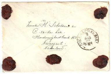| Keywords: Netherlands 1922-08-07 cover reverse.jpg en Netherlands 1922-08-07 cover sent registered from Nunspeet to Biberach Germany Franking of 35c with NVPH 65 and 109 Since this cover was sent registered it has been inspected by currency control authorities in Emmerich Germany circular purple postmark Sent to Dekan dean Scheurlen Paul Eugen Heinrich 25 09 1877 Königsbronn “ 13 12 1947 Biberach an der Riß Backside wax seal showing initials of sender 'HS' 1922-08-07 own scan Post of the Netherlands other versions See more images Netherlands 1922-08-07 cover jpg Netherlands 1922-08-07 cover reverse jpg LangSwitch Netherlands 1922-08-07 currency control cover to Biberach Germany Custom license marker 2016 09 11 PD-old Sealing wax Covers of the Netherlands 1922 Postmarks of Biberach an der Riss |