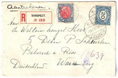 | Keywords: Netherlands 1922-08-07 cover.jpg en Netherlands 1922-08-07 cover sent registered from Nunspeet to Biberach Germany Franking of 35c with NVPH 65 and 109 Since this cover was sent registered it has been inspected by currency control authorities in Emmerich Germany circular purple postmark Sent to Dekan dean Scheurlen Paul Eugen Heinrich 25 09 1877 Königsbronn “ 13 12 1947 Biberach an der Riß Backside wax seal showing initials of sender 'HS' 1922-08-07 own scan Post of the Netherlands other versions See more images Netherlands 1922-08-07 cover jpg Netherlands 1922-08-07 cover reverse jpg LangSwitch Netherlands 1922-08-07 currency control cover to Biberach Germany Custom license marker 2016 09 11 PD-old Covers of the Netherlands 1922 Censored covers of the Netherlands Postmarks of Emmerich am Rhein Postmarks of the Netherlands Registration labels of the Netherlands |