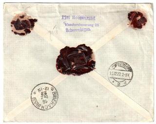 | Keywords: Netherlands 1922-12-14 cover Scheveningen reverse.jpg en Netherlands 1922-12-14 cover sent registered from Scheveningen to Biberach Germany Franking of 35c with NVPH 71 and 81 Since this cover was sent registered it has been inspected by currency control authorities in Emmerich Germany circular green postmark Manuscript frontside '1546' which is the inspector's number and backside German 'gut' meaning good Sent to Dekan dean Scheurlen Paul Eugen Heinrich 25 09 1877 Königsbronn “ 13 12 1947 Biberach an der Riß Backside wax seal showing the initials of the sender 'H' 1922-12-14 own scan Post of the Netherlands other versions See more images Netherlands 1922-12-14 cover Scheveningen jpg Netherlands 1922-12-14 cover Scheveningen reverse jpg LangSwitch Netherlands 1922-12-14 currency control cover to Biberach Germany Custom license marker 2016 09 11 PD-old Sealing wax Covers of the Netherlands 1922 Postmarks of Emmerich am Rhein Postmarks of Biberach an der Riss |