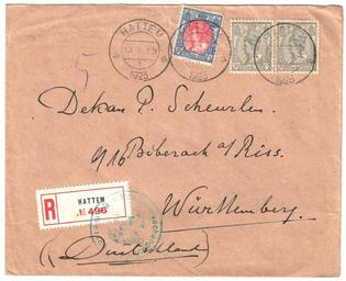 | Keywords: Netherlands 1923-01-13 cover.jpg en Netherlands 1923-01-13 cover sent registered from Hattem to Biberach Germany Franking of 35c with NVPH 65 and 81 pair Since this cover was sent registered it has been inspected by currency control authorities in Emmerich Germany Sent to Dekan dean Scheurlen Paul Eugen Heinrich 25 09 1877 Königsbronn “ 13 12 1947 Biberach an der Riß 1923-01-13 own scan Post of the Netherlands other versions Custom license marker 2016 09 11 PD-old Covers of the Netherlands 1923 Censored covers of the Netherlands Postmarks of Emmerich am Rhein Postmarks of the Netherlands Registration labels of the Netherlands |