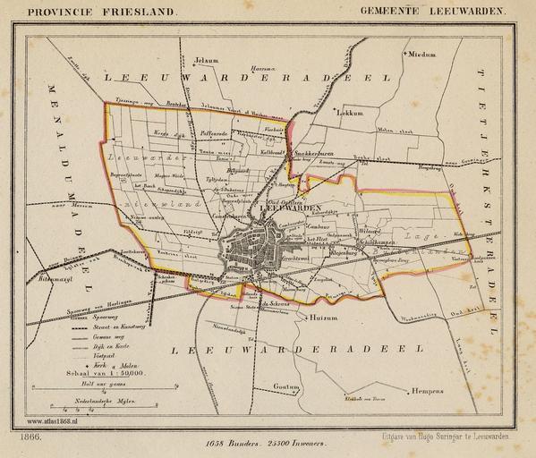 | Keywords: Netherlands, Leeuwarden, map of 1866.jpg nl Kaart uit 1866 van de gemeente Leeuwarden Friesland en Map from 1866 of the municipality of Leeuwarden Province of Friesland Netherlands Gemeente-atlas van Nederland naar officieele bronnen bewerkt J Kuyper 1866 Published around 1870 as part of a series of provincial atlases of the Netherlands This image is in the public domain The author J Kuyper died in 1908 In the Netherlands copyright expires 70 years after the death of the author or 70 years after first publication in the case of anonymous or pseudonymous works or works published by a legal entity Het auteursrecht in Nederland vervalt 70 jaar na de dood van de auteur of 70 jaar na de eerste openbaarmaking van het werk indien het gaat om een anoniem of om een onder pseudoniem verschenen werk of werk van een rechtspersoon The church in central Leeuwarden is at 53 12 15 24 N 5 47 50 57 E region NL Old maps of Leeuwarden 1866 Gemeente Atlas van Nederland - Friesland Netherlands in the 1860s PD-old |