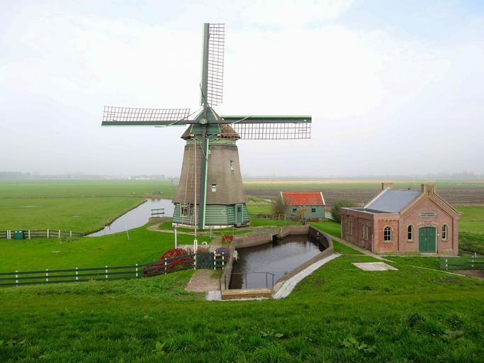 Keywords: netherlands scenic landscape buildings windmill architecture stream water flowers grass sky clouds fog nature outside country countryside summer spring