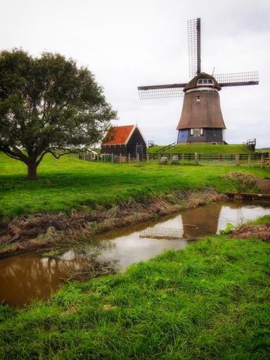 Keywords: netherlands windmill canal stream trees grass landscape scenic nature outside
