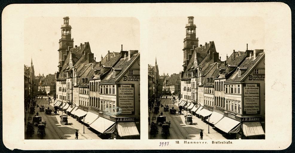 | Keywords: Neue Photographische Gesellschaft Stereoskopie 1907, Hannover 10 Breitestraße Bildseite Große Wallstraße Georgswall Alte Kanzlei Aegidienkirche Köbelingerstraße Buchdruckerei J. H. Bähre König & Ebhardt.jpg Bildseite mit der laufenden Nummer 10 aus der ab 1907 von der Neuen Photographischen Gesellschaft AG Berlin-Steglitz vertriebenen Stereoskopie-Kartenserie Hannover Der noch unidentifizierte Fotograf stand hier erhöht vor der Ecke Große Wall Straße heute Georgswall wo die Buchdruckerei J H Bähre ihre Produkte und Dienstleistungen anpries Zitat Schulartikel für alle Lehranstalten Schreibhefte Mal- und Zeichenmaterialien Bureau- und Kontor-Einrichtungen Anfertigung aller Drucksachen Visitenkarten usw Verkaufsstelle der Geschäftsbücher-Fabrik von J C König Ebhardt Galanteriewaaren Der Blick geht durch die Breitestraße vorbei an einigen älteren zum Teil in Fachwerk errichteten Gebäuden deren Aufschrift auch elektronisch bisher nicht lesbar gemacht werden konnten Zur Identifizierung wird die bis Ende 2014 vom Stadtarchiv Hannover und der Gottfried Wilhelm Leibniz Bibliothek - Niedersächsische Landesbibliothek geplante vollständige Digitalisierung sämtlicher Adressbücher der Stadt hilfreich sein Hinter dem Gebäude mit der Aufschrift Schuhwaren ist der Staffelgiebel der Alten Kanzlei an der Osterstraße zu erkennen die hier noch nicht bis zum heutigen Friedrichswall durchgebrochen wurde Hinter dem Turm der Aegidienkirche geht der Blick auf das Gebäude an der Ecke Köbelingerstraße und Marktstraße Noch nicht eindeutig geklärt sind die beiden über den Dächern emporragenden Turmspitzen Während die Straßenlaternen an den Fußgängerwegen wohl noch mit Gas der Imperial Continental Gas Association betrieben wurden deutet die die über der Straße aufgehängten Kabel auf den Beginn der elektrischen Straßenbeleuchtung Die Straße durch die die Straßenbahnschienen führen wird belebt durch zahlreiche Pferdekutschen und Menschen teils mit Handkarren Diese Karte wurde freundlicherweise von Ilse Paul zur Verfügung gestellt um sie als Digitalisat über Wikimedia Commons nachhaltig allen Menschen zur Verfügung zu stellen Scan vom Original Bernd Schwabe mit Dank an die Stifterin Ilse Paul ~ 1907 unknown photographer to Neue Photographische Gesellschaft Berlin unidentified people of осква <gallery> File Neue Photographische Gesellschaft Stereoskopie 1907 Hannover 10 Breitestraße Rückseite mit Namen der Gesellschaft und Erst-Vertriebsdatum blauer Stempel Moskau russisch handschriftliche Notzi jpg Rückseite der Karte mit blauem Stempel Hinweis auf Moskau und handschriftlicher Notiz in russischer Sprache </gallery> pd-old Neue Photographische Gesellschaft Berlin Stereo cards of Hannover J H Bähre Hannover König Ebhardt Alte Kanzlei Hannover Aegidienkirche Hannover Köbelingerstraße Hannover Georgswall Hannover Horses in Hannover People of Moscow Carriages in Germany Documents by Ilse Paul |