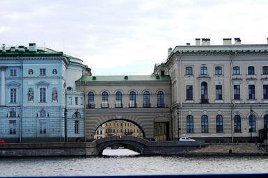 Keywords: neva river adjoined buildings arched adjacent road bridge archtecture