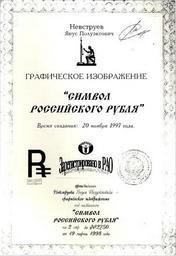 | Keywords: NevstruevRublSign.jpg ru Авто ское свидетельство 2750 от 19 03 1998 г выданное Российским авто ским обществом евст уеву Янусу Полуэктовичу на п оизведение п едставляющее собой г афическое изоб ажение Символ оссийского убля кото ое было создано 20 11 1997 г Личный а хив Российское авто ское общество 1998-03-19 Данный документ был опубликован нап име в каталоге выставки Знаку убля http //rursign com/sites/default/files/book pdf Russian Ruble symbol | ||||