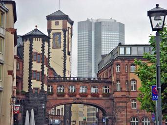 | Keywords: New city hall Frankfurt Neues Rathaus Seufzerbruecke Kleiner Cohn Langer Franz Paulsplatz Altstadt.jpg English The new city hall of Frankfurt am Main from 1908 situated next to the famous Pauls church near the Roemerberg In the middle of this administrative building with a restaurant in the cellar there is the sigh bridge of Frankfurt the tower in the front on the left side is kleiner Cohn little Cohn and the other neogothic tower is Langer Franz big/long Franz It is intended to restore both towers in their original form like it was before the building was heavily damaged in the 2nd World War Deutsch Das Neue Rathaus von Frankfurt am Main nahe der berühmten Paulskirche am nach dieser benannten Paulsplatz in unmittelbarer Nähe des Römerbergs innerhalb der à berreste der Frankfurter Altstadt In der Mitte dieses Verwaltungsbaus von 1908 befindet sich die sogenannte Seufzerbrücke ; der kürzere Turm im Vordergrund wird als Kleiner Cohn bezeichnet der größere neugotische Turm im Hintergrund nennt sich Langer Franz Es ist seit einigen Jahren angedacht beide Türme sowie den kompletten Dachbereich des Neuen Rathauses zu rekonstruieren Und zwar im Erscheinungsbild das vor den Zerstörungen des 2 Weltkrieges noch existierte denn die Wiederherstellung wurde sehr vereinfacht und schnell durchgeführt und entspricht nun nicht mehr den Vorstellungen einer gelungenen Rekonstruktion im Gegensatz zum Römerberg beispielsweise own 2007-08-09 Horst-schlaemma Langer Franz Neues Rathaus “ Nordbau Frankfurt Neues Rathaus “ Südbau Frankfurt Seufzerbrücke Frankfurt Files by User Horst-schlaemma Eurotower Frankfurt |