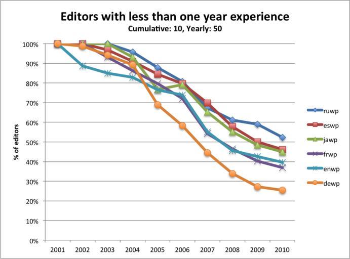 Keywords: New-editors-across-projects--10-50-.png en Percent of editors with less than one year experience Ru es ja fr en dp 2001-2010 WMF Howief Cc-zero Editor trends study