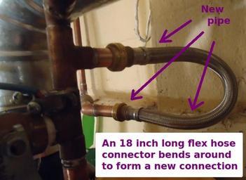 | Keywords: New flex hose connection links two three fourths inch copper pipes over a hot water heater.jpg en A leaky pipe over a hot water heater might cause mold in addition to possible rust issues; accordingly the leaky pipe section was cut out not shown and replaced with this flex connector hose which links two three-fourths inch diameter copper pipes diameter measured from the inside in this plumbing project by a handyman 2012-08-08 own Tomwsulcer cc-zero Uploaded with UploadWizard Plumbing Hose connectors Handyman projects |