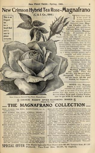 | Keywords: New floral guide (16240773384).jpg New Floral Guide Spring 190J <br> New Crimson Hybrid Tea Rose--A\a_gnafrano <br> HIS Grand Rose <br> is the result of <br> a cross between <br> the splendid Hybrid <br> Perpetual Rose Mag - <br> na Charta with the <br> beautiful and well-known <br> Safi-auo Tea It is named <br> after both parents Masi 'na- <br> fraiio It combines all the <br> hardiness and vigor of the <br> Magna Charta with the free-blooming <br> habit and delightful fragrance <br> of the Tea Roses The flowers are <br> extra large frequently four to five <br> inches across; very regular full and <br> double and deliciously sweet The <br> color is deep bright shining rose <br> very rich and handsome The bush <br> IS a strong upright grower and a <br> constant and most abundant <br> bloomer especially recom- <br> mended as one of the <br> very finest Hardy Ever- <br> Blooming Roses for <br> garden planting and <br> also for cut flowers <br> Price S t r o 11 ยฃยป ข <br> Mailing Plants 25 <br> cts each; Two for <br> 40 cts ; 2 00 per doz <br> Postpaid Two-year Size <br> 45 cts each 4 00 per <br> dozen by l xpress <br> NOTE The Magna- <br> fraiio is most especially <br> valuable for garden planting <br> and as we want it to have an ex- <br> tensive trial this season we have selected <br> Se\ en other New and Choice Varie- <br> ties to go with it making- a set of <br> New Crimson Hybrid Tea Rose Magnafrano <br> ยง-CHOICB HARDY 0;v R-BI OOMING ROSBS-g <br> Which We CaU- <br> THE MAGNAFRANO COLLECTION <br> NEW HYBRID TEA ROSE MAGNAFRANO See de- <br> scription above <br> NEW HYBRID TEA ROSE ADMIRAL DEWEY A <br> splendid new Constant-Blooming Rose flowers large and <br> beautifully formed quite full and double with broad <br> shell-shaped petals delightfully tea-scented; color rich <br> creamy rose delicately shaded with fine golden-yellow <br> and peach blossom tints A clean healthy grower and <br> abundant bloomer very handsome 20 cts each larger <br> size 35 cts postpaid Two-year size 50c express <br> ROSE D'EVIAN Is a strong bushy grower with stout <br> stems and thick glossy green leaves The flowers are <br> largeandhandsome somewhat cup-shaped but well filled <br> and very sweet The color is deep rich rosy red reverse <br> petals of pale amaranth; makes extra long pointed buds <br> and blooms abundantly all through the Summer and <br> Fall 15 cts each larger size 20 cts postpaid Two- <br> year size 35 cts each by express <br> AUGUSTA VICTOR A A new hardy Tea Rose of vigorous <br> growth and rich handsome foliage Extra large finely <br> formed flowers ver\' double and sweet; color pure white <br> shaded lemon; grand in ever\' way 15 cts each; larger <br> size 20c postpaid Two-year size 35c by express <br> MAD JULES GROLEZ A new Rose of great beauty very <br> handsome buds and large full finely formed flowers; the <br> color is lovely China rose passing to clear rich satiny pink <br> remarkably bright and attractive 15 cts each larger <br> size 30c postpaid Two-year size 35c by express <br> VIRGINIA A very beautiful rose pure deep yellow; both <br> buds and flowers very handsome and borne in great pro- <br> fusion all through the season; healthy grower and abund- <br> ant bloomer 15 cts each; larger size 30 cts post- <br> paid Two-year size 30 cts by express <br> SOUV DE PRESIDENT CARNOT This is a rose of <br> extraordinary beauty is elegantly formed very large full <br> and deep and deliciously sweet The color is lovely sea- <br> shell pink delicately tinted with golden fawn on rich <br> creamy white Superb for house culture and also for bed- <br> ding in open ground 15 cts each; larger size 30 cts <br> postpaid TAVo-year size 35 cts by express <br> MAD FERNET DUCHER YELLOW LA FRANCE-A <br> very pretty rose constant and abundant bloomer; color; <br> bright canarv vellow quite large full and very fragrant <br> highly recomm'ended for bedding and house culture 15 <br> cts each; lararer size 20 cts postpaid Two-j ear <br> size 35 cts by express <br> 1 25 <br> PFfl A T fiFFFI Ei-ht Splendid New Koses only 1 10; Larg er Size <br> OiEtlitlv Ui 1 LIV Postpaid Two-Year Size 2 50 by express 42484171 134532 67120 Page 9 Text http //www biodiversitylibrary org/page/42484171 1901 10 1111/j 1469-7998 1865 tb02381 x Conard Jones Co West Grove Pa ; Henry G Gilbert Nursery and Seed Trade Catalog Collection NameFound Charta NameConfirmed Charta NameBankID 4106878 Biodiversity Heritage Library New floral guide 1901 Garden Stories Bulbs Plants Catalogs Nursery stock Plants Ornamental Roses Seeds U S Department of Agriculture National Agricultural Library bhl page 42484171 dc identifier http //biodiversitylibrary org/page/42484171 Conard Jones Co Flowers West Grove PA Conard Jones Co bhlGardenStories BHLinbloom bulbs plants plants ornamental u s department of agriculture national agricultural library west grove pa conard jones co bhlgardenstories bhlinbloom Information field Flickr posted date ISOdate 2015-03-19 Check categories 2015 August 23 CC-BY-2 0 BioDivLibrary https //flickr com/photos/61021753 N02/16240773384 2015-08-23 23 56 22 cc-by-2 0 PD-old-70-1923 New floral guide 1901 Photos uploaded from Flickr by Fรฆ using a script |