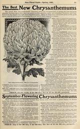 | Keywords: New floral guide (16655926937).jpg New Floral Guide Spring 1901 <br> 61 <br> The Best M w Chrysanthemums <br> The grand New Chrysanthemums described below are recommended as among the best and most <br> valuable varieties up-to-date they are good healthy growers early and abundant bloomers and bear <br> flowers of the largest size and most beautiful colors Many of them have taken first prizes at the great <br> shows and all are recognized as among the very best of their respective classes <br> lORA This is a grand Chrysanthemum <br> Extra large full flowers with beautiful <br> tubular petals; clear bright pink; fine <br> artistic form very large size; a strong <br> vigorous grower; early and abundant <br> bloomer 12 cts each <br> MRS F A CONSTABLE-A magnifi- <br> cent pure white variety which always <br> attracts a great deal of attention owing <br> to its beautiful form ud fine finish <br> 12 cts each <br> MRS J J GLESSNER This is a very <br> handsome variety for garden planting; <br> makes a neat compact bush covered <br> with large showy flowers; color light- <br> yellow rich apricot shading 12c each <br> SHILOWA Brilliant crimson an ele- <br> gant Japanese variety with long tv/isted <br> petals; extra fine bright red for garden <br> planting; a good bloomer 12 cts each <br> AUTUMN GLORY A grand Japanese <br> variety; immense bloomer; color deep <br> salmon changing to soft shrimp pink; <br> always makes a grand display of flow- <br> ers; showy and handsome 12 cts each <br> BLACK BEAUTY Extra large flowers; <br> very dark deep red; a dwarf sturdy <br> grower and very free bloomer; excel- <br> lent for garden planting 12 cts each <br> LEONIDES Extra large full regular flow- <br> ers with straight flat petals; color deep <br> rich amaranth finely shaded with maroon <br> 12 cts each <br> THE QUEEN Avery popular white variety; large <br> full flowers; a grand sort for general planting and <br> also for exhibitions 12 cts each <br> FISHER'S TORCH Pure deep red very bright and <br> showy; makes large bold flowers borne erect on <br> stiff stems; a good free bloomer and a general <br> favorite 12 cts each <br> BLACK HAWK Largest and most beautiful dark <br> crimson scarlet looks as if made of crimson vel- <br> vet large full and deep; superb in every way <br> 12 cts each <br> KLONDIKE A splendid variety deep rich golden <br> yellow; large solid flowers reflexed petals; one of <br> the best yellow sorts 12 cts each <br> JOHN SHRIMPTON Grand deep red flowers very <br> bright and striking; a neat compact grower and <br> abundant bloomer 12 cts each <br> PINK IVORY Extra large incurved globular flow- <br> ers; bright clear rose-pink; an ideal variety of this <br> color; stands at the head 12 cts each <br> WILLIAM SIMPSON Immense flowers; very deep regu- <br> lar and full; fine rich rosy pink; reverse of petals silver- <br> rose; one of the earliest large-flowering varieties and has <br> taken highest prizes whenever exhibited 12 cts each <br> ROSE OWEN A grand early variety; large perfect form; <br> a splendid flower of clear bright shining pink 12c each <br> PRICE 12 cts each; 5 for 50 cts ; Set of 17 for 1 60 postpaid <br> S eptember-Flowering' Chrysanthemums <br> These are partictilarly desirable because they bloom early and make a grand display of flowers <br> before the cold weather injures the blooms <br> New Clirysanthemum Mrs F A Constable <br> LIBERTY Very beautiful incurved form perfectly double <br> globular flowers; deep rich golden-yellow; very beautiful <br> 12c each <br> MRS W J BRYAN Extra fine bright chrome-yellow; a <br> magnificent flower and an early and abundant bloomer <br> 12 cts each <br> BARON VEILLARD Ivarge double flowers; brilliant yel- <br> low with rosy-crimson markings; fine 12 cts each <br> GLORY OF THE PACIFIC Beautiful clear pink; large <br> round flowers wnth broad petals; immense bloomer and <br> very showy 12 cts each <br> MISS KATE BROWN One of the earliest and most <br> abundant bloomers; loaded with large pure white flowers <br> 12 cts each <br> MME GASTELIER Pure white with lemon centre; flow- <br> ers large and full a good early bloomer 12 cts each <br> CAMILLE BERNARDIN Large and handsome; bright <br> violet-pink; very clear and beautiful; one of the best for <br> general planting 12 cts each <br> WE CHIQUOT Early and beautiful; perfectly double <br> flowers of medium size; regular and solid form; color rich <br> coppery-yellow with brick-red centre; fine 12 cts each <br> PKICE Any 3 for 30 cts ; 7 for 65 cts ; tlie Set of 11 for S5 cts postpaid <br> ARBRE de NOEL A very early and abundant bloomer; <br> medium size flowers; very double and full; deep orange <br> shaded red tipped with yellow; handsome and distinct <br> 12 cts each <br> EDITH SYRATT One of the most beautiful varieties yet <br> produced; large full graceful flowers; rich violet-pink <br> shading to purplish-rose; reverse of petals silver-rose; <br> blooms very early and makes a grand show 12 cts each <br> MIDGE The best dwarf early white extra large beautiful <br> flowers very full and regular and pure white; the whole <br> plant appears one mass of flowers 12 cts each <br> MME GENEVE CASSAGNEAU Fine largfe regular <br> flowers; elegant flesh-pink with canary-yellow centre; <br> very pretty and attractive; a good healthy grower and very <br> free bloomer 12 cts each <br> MARION HENDERSON A magnificent early yellow sort; <br> invaluable to lovers of early Fall flowers 12 cts each 42484223 134532 67120 Page 61 Text http //www biodiversitylibrary org/page/42484223 1901 10 1111/j 1469-7998 1865 tb02381 x Conard Jones Co West Grove Pa ; Henry G Gilbert Nursery and Seed Trade Catalog Collection NameFound Chrysanthemum NameConfirmed Chrysanthemum EOLID 38388 NameBankID 2657422 NameFound Leonides NameConfirmed Leonides EOLID 8907570 NameBankID 4216925 Biodiversity Heritage Library New floral guide 1901 Garden Stories Bulbs Plants Catalogs Nursery stock Plants Ornamental Roses Seeds U 