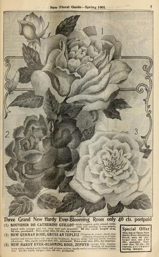 Keywords: New floral guide (16677004729).jpg New Floral Quide ” Spring 190L <br> Three Grand New Hardy Ever-Blooming Roses only 40 cts postpaid <br> 1 SOUVENIR DE CATHERINE GUILLOT- ch coppeg jom <br> tinted with orange and red very rare and beautiful 30 cts each; larger siz6» <br> 25 cts postpaid Two-year size 35 cts by express <br> NEW GERMAN ROSE GRUSS AN TEPLITZ 5 ° t- to wm <br> crimson changing to bright <br> scarlet and velvety fiery red one of the brightest; fiovrers large full and sweet blooms <br> all season 20c each; larger size 25c postpaid Two-year size 40c by express <br> NEW HARDY EVER-BLOOMING ROSE ZEPHYR- J f f JiJ S f <br> ivory white shaded with blush and sulphur yellow hardy and a constant bloomer extra <br> fine 15 cts each; larjjer size 20 cts postpaid <br> 2 <br> 3 <br> Special Offer <br> This Set of Three New <br> Hardy Ever-blooming <br> Roses only 40 cts ; <br> larger size the 3 for <br> 50c postpaid Two- <br> year size 85 cts by <br> express purchaser <br> paying charges 42484169 134532 67120 Page 7 Text http //www biodiversitylibrary org/page/42484169 1901 10 1111/j 1469-7998 1865 tb02381 x Conard Jones Co West Grove Pa ; Henry G Gilbert Nursery and Seed Trade Catalog Collection Biodiversity Heritage Library New floral guide 1901 Garden Stories Bulbs Plants Catalogs Nursery stock Plants Ornamental Roses Seeds U S Department of Agriculture National Agricultural Library bhl page 42484169 dc identifier http //biodiversitylibrary org/page/42484169 Conard Jones Co Flowers West Grove PA Conard Jones Co bhlGardenStories BHLinbloom bulbs plants plants ornamental u s department of agriculture national agricultural library west grove pa conard jones co bhlgardenstories bhlinbloom Information field Flickr posted date ISOdate 2015-03-19 Check categories 2015 August 23 CC-BY-2 0 BioDivLibrary https //flickr com/photos/61021753 N02/16677004729 2015-08-23 23 55 57 cc-by-2 0 PD-old-70-1923 New floral guide 1901 Photos uploaded from Flickr by Fæ using a script