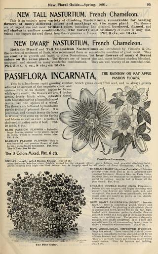 | Keywords: New floral guide (16863247945).jpg New Floral Guide ” Spring 1901 <br> 95 <br> NEW TALL NASTURTIUM French Chameleon <br> This is an entirely new variety of climbing' Nasturtiums remarkable for bearing <br> flowers of many different colors and markings on the same plant The flowers <br> are of largest size and most brilliant colors including fine blotched bordered flamed and <br> self shades in endless combination The variety and brilliancy of colors is truly mar- <br> velous ; we import the seed direct from the originators in France Pkt 5 cts oz 15 cts <br> NEW DWARF NASTURTIUM French Chameleon <br> Both the Dwarf and Tall Chameleon Nasturtiums are introduced by Vilmorin Co i <br> the celebrated seedsmen of Paris who recommend them as remarkable novelties of great merit They <br> are similar in growth and habit to other Nasturtiums but bear flowers of many different <br> colors on the same plant The flowers are of largest size and most brilliant shades; blotched <br> margined and stained in many wonderful combinations They are well worthy of an extended trial <br> Pkt 5 cts Yz oz 8 cts ; oz 15 cts <br> THE RAINBOW OR MAY APPLE <br> PASSION FLOWER <br> PASSIFLORA INCARNATA <br> This is a handsome rapid growing climber winch grows easily from seed and is always greatly <br> admired on account of the exquisite color and <br> curious form of its flower; begins to bloom <br> while quite small ; the flowers are 3 to 4 inches <br> across lovely blush white delicately tmted <br> with blue and having a beautiful rayed <br> centre like the spokes of a wheel <br> The flow ers are followed by handsome <br> purple fruits of pleasant flavor It is <br> perennial and though itmay die down <br> in Winter will come up in the Spring <br> and bloom as well as ever ; a partially <br> sheltered situation suits it best Pkt <br> 20 seeds 8 cts <br> BLUE PASSION FLOWER ” Splendid <br> large flowers similar to the above except <br> in color which is beautiful violet blue <br> Pkt 8 cts <br> SCARLET PASSION FLOWER ” Thi Is <br> the beautiful red passion flower of Cali- <br> fornia ; exceedingly handsome Pkt 8 cts <br> The 3 Pkts for 30 cts <br> The 3 Colors Mixed Pkt 6 cts <br> SMILAX usually called Boston Smil«x -One of the Passlflora Incarnata <br> most desirable window vines highly valued for its elegant glossy green foliage and graceful climbing habit; <br> grows several feet high the first seasor and is largely used in all kinds of floral decorations Pkt 4 cts <br> THE BLUE DAISY Agathea Coelestis ” It blooms <br> quickly from seed and is most abundant and <br> constant bloomer; flowers like the Paris Daisy <br> but deep blue; an ornament to the flower bed and <br> useful for cutting; may be had in bloom all the <br> year round Pkt 4 cts <br> ENGLISH DOUBLE DAISY Bellis Perennis ” <br> Daisies are sure to grow and begin blooming very <br> quickly; the flowers are white pink red and <br> variegated; the most of them come double and the <br> single ones are nearly as pretty as the double <br> Finest mixed 4 cts <br> NEW GIANT CALIFORNIA POPPY Irresis- <br> table Here is something grand showy and <br> ™¦ ¢ Irresistable for planting in all suitable places <br> in garden and lawn grows five to six feet high <br> loaded with immense perfectly double flowers <br> almost as round as a ball and of the most exquisite <br> color pure melting rose The petals are elegantly <br> fringed and taken altogether it is a rare and <br> splendid novelty of commanding beauty sure to <br> make a sensation wherever seen Pkt 6 cts <br> NEW AQUELIGEAS IMPROVED HYBRIDS <br> Very fine mixed These beautiful H3' brid Colum- <br> bines are remarkable for the size and novel forms <br> of their flowers and their many beautiful colors <br> They are perfectly hardy and bloom many weeks <br> every season Fine for borders and bedding <br> The Blue Daisy Pkt 6 cts <br> -_ - \- --- ' -'a 42484257 134532 67120 Page 95 Text http //www biodiversitylibrary org/page/42484257 1901 10 1111/j 1469-7998 1865 tb02381 x Conard Jones Co West Grove Pa ; Henry G Gilbert Nursery and Seed Trade Catalog Collection NameFound Agathea NameConfirmed Agathea NameBankID 8990051 NameFound Bellis NameConfirmed Bellis L EOLID 59430 NameFound Coelestis NameConfirmed Coelestis EOLID 8889111 NameBankID 3009138 NameFound Passiflora incarnata NameConfirmed Passiflora incarnata EOLID 14005600 NameBankID 2668431 NameFound Smilax NameConfirmed Smilax Jorge08 EOLID 3396175 Biodiversity Heritage Library New floral guide 1901 Garden Stories Bulbs Plants Catalogs Nursery stock Plants Ornamental Roses Seeds U S Department of Agriculture National Agricultural Library bhl page 42484257 dc identifier http //biodiversitylibrary org/page/42484257 Conard Jones Co Flowers West Grove PA Conard Jones Co bhlGardenStories BHLinbloom bulbs plants plants ornamental u s department of agriculture national agricultural library west grove pa conard jones co bhlgardenstories bhlinbloom Information field Flickr posted date ISOdate 2015-03-19 Check categories 2015 August 23 CC-BY-2 0 BioDivLibrary https //flickr com/photos/61021753 N02/16863247945 2015-08-23 23 51 14 cc-by-2 0 PD-old-70-1923 New floral guide 1901 Photos uploaded from Flickr by Fæ using a script |