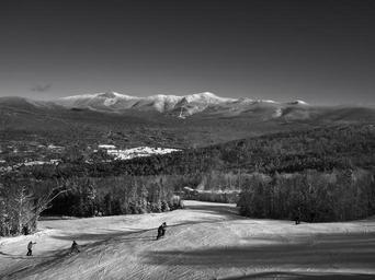Keywords: new hampshire mountains landscape scenic skiers skiing slope forest trees winter snow outside countryside black and white
