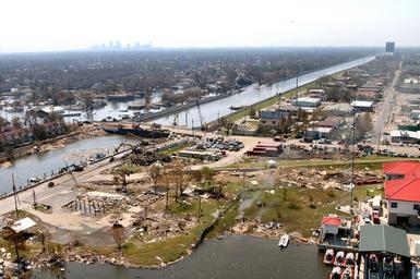 | Keywords: New Orleans USACE-17th Canal-A-09-04-05 0004.JPG New Orleans after Hurricane Katrina The 17th Street Canal stretches southward the boundry between Jefferson and Orleans Parishes in Louisiana This aerial photo was taken Sunday September 4 2005 The bridge in the foreground The Old Hammond Highway Bridge undergoing a rebuilding before the storm enabled Army Corps of Engineers contracts to drive sheet piling to close off the canal from Lake Ponchartrain The Lake Pontchartrain end of the Canal is just over block distant off the lower left edge of the photo Looking down the canal the breach into Orleans Parish is visible The skyline of the New Orleans Central Business District lies in the distance In the front center left the pilings are all that remain of locally famous Sid-Mar's Seafood Restaurant destroyed by the storm U S Army Corps of Engineers photo by Alan Dooley http //www usace army mil/katrina-images/NO-A-09-04-05_0004 JPG Related images include <gallery> Image New Orleans USACE-Blackhawk-A-09-04-05 0072 jpg Blackhawk helicopter delivering sandbag Pattern of sandbags is similar to this image Image Sheet pile New Orleans-09-04-05 JPG Sheet pile material </gallery> PD-USGov 17th Street Canal after Katrina Hurricane Katrina aftermath in New Orleans Sheet piling |
