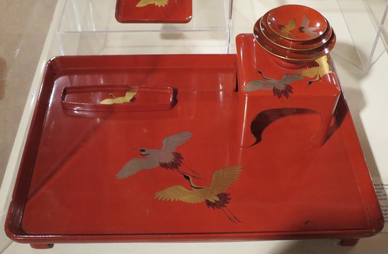 Keywords: New Year sake set with images of cranes from Japan, lacquer on wood, late 19th century.JPG en New Year sake set with images of cranes from Japan lacquer on wood late 19th century own Hiart photo 2014 Cranes in Japanese art Lacquerware of Japan Sake sets Cc-zero |
