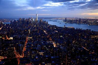 Keywords: new york manhattan city big city capital skyscraper big apple usa empire state building skyline america united states building old downtown new york city hudson river homes many small light lights twilight sunset clouds sky colorful color darkness night evening urban fast movement abendstimmung horizon foresight