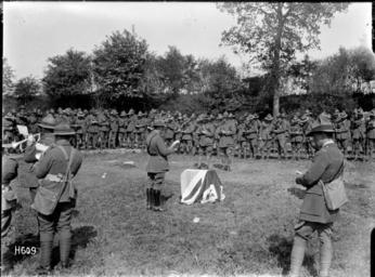 | Keywords: blackandwhite monochrome outdoor black and white A New Zealand Artillery church parade in the wagon lines during World War I. The congregation is singing a hymn accompanied by soldiers playing brass instruments, at left. Photograph taken Louvencourt 19 May 1918 by Henry Armytage Sanders. Inscriptions: Inscribed - Photographer's title on negative -bottom left: H609. Quantity: 1 b&w original negative(s). Physical Description: Dry plate glass negative 4.75 x 6.5 inches New Zealand Artillery church parade, Louvencourt. Royal New Zealand Returned and Services' Association :New Zealand official negatives, World War 1914-1918. Ref: 1/2-013217-G. Alexander Turnbull Library, Wellington, New Zealand. natlib.govt.nz/records/22816274 A New Zealand Artillery church parade in the wagon lines during World War I. The congregation is singing a hymn accompanied by soldiers playing brass instruments, at left. Photograph taken Louvencourt 19 May 1918 by Henry Armytage Sanders. Inscriptions: Inscribed - Photographer's title on negative -bottom left: H609. Quantity: 1 b&w original negative(s). Physical Description: Dry plate glass negative 4.75 x 6.5 inches New Zealand Artillery church parade, Louvencourt. Royal New Zealand Returned and Services' Association :New Zealand official negatives, World War 1914-1918. Ref: 1/2-013217-G. Alexander Turnbull Library, Wellington, New Zealand. natlib.govt.nz/records/22816274 |