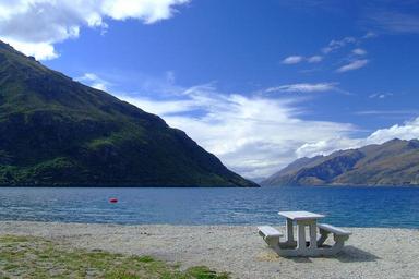 Keywords: new zealand lake seating heaven exploring clouds afternoon water adventure travel sunny whites nature blue sky mountains