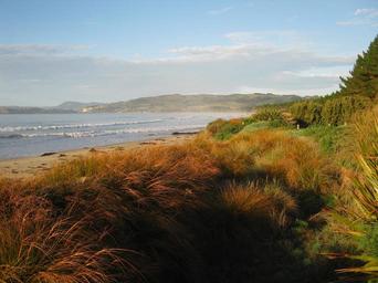Keywords: new zealand landscape plants grass foliage sea ocean water beach coastline shoreline mountains sky clouds scenic fall autumn nature outside