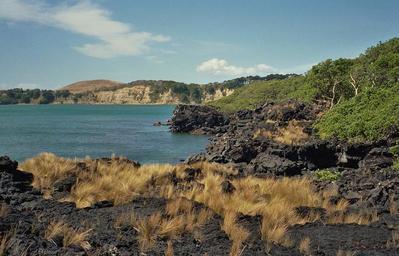 Keywords: new zealand sea ocean water plants beach lava grass coast shoreline sky clouds outside nature