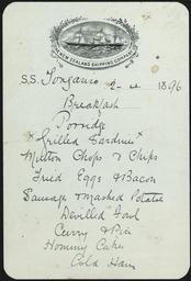 | Keywords: text writing sketch drawing document Menu lists porridge, grilled sardines, mutton chops & chips, fried eggs & bacon, sausages & mashed potatoes, devilled fowl, curry & rice, hominy cakes, and cold ham. At the top is a small portrait of a steam and sailing ship in an oval inset. Quantity: 1 b&w photo-mechanical print(s) and holograph on menu.. Physical Description: Ink and engraving on blue sheet, 165 x 110 mm. Provenance: Purchased from Cavendish Philatelic Auction, Derby, in November 1998. New Zealand Shipping Company :S.S. "Tongariro". Breakfast [menu]. 2.4.1896.. Ref: Eph-A-SHIP-1896-02. Alexander Turnbull Library, Wellington, New Zealand. natlib.govt.nz/records/22885135 Menu lists porridge, grilled sardines, mutton chops & chips, fried eggs & bacon, sausages & mashed potatoes, devilled fowl, curry & rice, hominy cakes, and cold ham. At the top is a small portrait of a steam and sailing ship in an oval inset. Quantity: 1 b&w photo-mechanical print(s) and holograph on menu.. Physical Description: Ink and engraving on blue sheet, 165 x 110 mm. Provenance: Purchased from Cavendish Philatelic Auction, Derby, in November 1998. New Zealand Shipping Company :S.S. "Tongariro". Breakfast [menu]. 2.4.1896.. Ref: Eph-A-SHIP-1896-02. Alexander Turnbull Library, Wellington, New Zealand. natlib.govt.nz/records/22885135 |