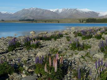Keywords: new zealand south island mountains nature landscape lake tekapo meadow outlook tourism holiday summer flowers lupins scree