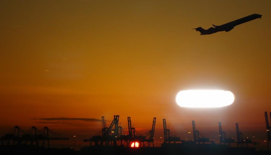 Keywords: Newark airport sunrise looking east.jpg en The sun rises bottom center below the cranes of a nearby seaport while a plane takes off from Newark Airport The bright oval light is a reflection of the camera's flash in the terminal window Looking eastwards 2012-03-08 own Tomwsulcer cc-zero Uploaded with UploadWizard Sunrises of New Jersey Bombardier Canadair Regional Jet Seaports Newark Liberty International Airport |