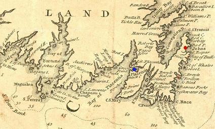 | Keywords: Newfoundland1744Annotated.jpg Extract from a 1746 map depicting southeastern Newfoundland In addition to crop for selection image has had levels and colors adjusted to improve contrast and has been annotated to show a few places of importance in Queen Anne's War Plaisance is marked in blue St John's is marked with a large red spot and Ferryland and B Boston Public Library Norman Leventhal Map Center http //maps bpl org/details_14079/ 1746 Jacques Bellin; annotations by User Magicpiano File Newfoundland1744 jpg Norman Leventhal Center Old maps of Newfoundland History of Newfoundland and Labrador Old maps of Canada Old maps of Saint-Pierre and Miquelon War of the Spanish Succession PD-US |