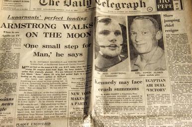 Keywords: newspaper historic first moon landing armstrong aldrin photos print text paper front page journalism telegraph british 1969