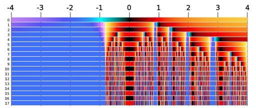 | Keywords: Newton z3-2z+2 iterates R.png Color coded analysis of the dynamics of Newton's method for the polynomial <math>z\mapsto z 3-2z+2</math> on the real axis in the range from <math>-4</math> to 4 Each row shows the color-coded value of z after n-fold applying of the method The uppermost line n<nowiki> </nowiki>0 shows the colors of the numbers <math>-4</math> to 4 themselves This polynomial has one real root at z ‰ˆ-1 8 whose color code is medium blue Other colors code for <math>-1</math> cyan zero black one red infinity white etc Examples starting from any z less than <math>-1</math> left part of the image converges to the real root medium blue Starting at z<nowiki> </nowiki>0 produces an endless cycle between 0 and 1 black red black red own original text eigene Arbeit 1 2008-04-09 Georg-Johann Lay Complex color plots Newton fractals Real number line |