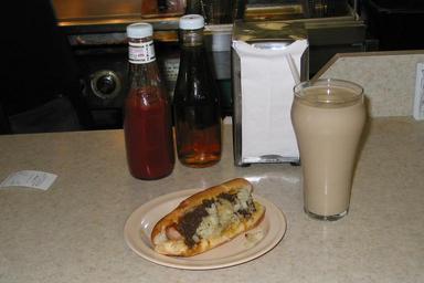 Keywords: NewYorkSystemWeinerAlc1.JPG en A New York System Weiner and a glass of Coffee Milk Olneyville New York System Restaurant - Providence RI own Alcinoe 2009-03-28 Hot dog stands and restaurants Coffee with milk Napkin holders