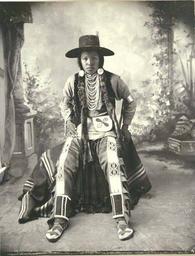 | Keywords: Nez Perce Indian, Washington, 1899 (LAROCHE 165).jpeg Photograph Creator Frank La Roche Caption on image Nez Perces brave Studio portrait of a young man of the Nez Perce Washington State 1899 He is wearing a wide-brimmed hat earrings necklaces fur decorations around his shoulders a beaded bag arm bands trousers and moccasins He is seated on a blanket covered prop in front of a painted backdrop of an arbor Another shot from the sitting in NA907 Subjects LCSH Portraits-Washington State ; Nez Perce Indians--Clothing dress depicted place Washington state 1899 Institution University of Washington UWASH-LAROCHE-source accession number laroche 165 PD-old-auto-1923 1936 Information field Order Number LAR127 Nez Perce Fur clothing of Nez Perce people 19th-century portrait photographs of sitting men at full length 1899 in Washington state Moccasins |