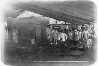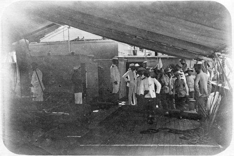 | Keywords: monochrome blackandwhite black and white NH 105297: Filipino insurgent surrender, 1902. Insurgents of Filipino General Guevara's army on board the U.S. Navy collier Nanshan on 26 April 1902, while being transported from the mouth of the Gandara River to Catbalogan, Samar, where they formally surrendered. This surrender ended the guerilla warfare in the Philippines that began in 1899. Courtesy of the Naval Historical Foundation. Collection of Captain Washington Irving Chambers, donated by Captain E. R. Chambers, 1951. U.S. Naval History and Heritage Command Photograph. NH 105297: Filipino insurgent surrender, 1902. Insurgents of Filipino General Guevara's army on board the U.S. Navy collier Nanshan on 26 April 1902, while being transported from the mouth of the Gandara River to Catbalogan, Samar, where they formally surrendered. This surrender ended the guerilla warfare in the Philippines that began in 1899. Courtesy of the Naval Historical Foundation. Collection of Captain Washington Irving Chambers, donated by Captain E. R. Chambers, 1951. U.S. Naval History and Heritage Command Photograph. |