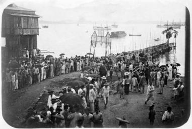 | Keywords: blackandwhite monochrome black and white NH 105298: Filipino insurgent surrender, 1902. The first lighter load of insurgents of Filipino General Guevara's army approaching the wharf at 4 pm on 26 May 1902 at Catbalogan, Samar, where they formally surrendered. The insurgent soldiers had been brought to Catbalogan by the collier USS Nanshan and were transferred there to lighters. The small gunboat just beyond the lighter may be USS Basco, which assisted in the operation. This surrender ended the guerilla warfare in the Philippines that began in 1899. Courtesy of the Naval Historical Foundation. Collection of Captain Washington Irving Chambers, donated by Captain E. R. Chambers, 1951. U.S. Naval History and Heritage Command Photograph. NH 105298: Filipino insurgent surrender, 1902. The first lighter load of insurgents of Filipino General Guevara's army approaching the wharf at 4 pm on 26 May 1902 at Catbalogan, Samar, where they formally surrendered. The insurgent soldiers had been brought to Catbalogan by the collier USS Nanshan and were transferred there to lighters. The small gunboat just beyond the lighter may be USS Basco, which assisted in the operation. This surrender ended the guerilla warfare in the Philippines that began in 1899. Courtesy of the Naval Historical Foundation. Collection of Captain Washington Irving Chambers, donated by Captain E. R. Chambers, 1951. U.S. Naval History and Heritage Command Photograph. |