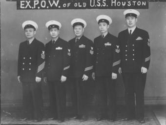 | Keywords: people monochrome groupshot blackandwhite black and white NH 106866 Chinese American ex-Prisoners of War These Navy servicemen served on board USS Houston (CA-30), which was sunk by the Japanese on 1 March 1942. From left to right: Chief Steward Marco Su, USN, (died in Hong Kong, 1 September 1971); Steward Second Class Shun Ching Kei, USN, (died in Martinez, California, 27 May 1991); Steward First Class Yu Kun, USN, (died in Hong Kong); Steward First Class Ah Chie, USN, (died in Hong Kong, 1980); and Steward First Class Chu Lin Tsao, USN, (died in San Diego, 23 May 2005). Donation of Mr. Jim Huen, 2009. U.S. Naval History and Heritage Command Photograph. NH 106866 Chinese American ex-Prisoners of War These Navy servicemen served on board USS Houston (CA-30), which was sunk by the Japanese on 1 March 1942. From left to right: Chief Steward Marco Su, USN, (died in Hong Kong, 1 September 1971); Steward Second Class Shun Ching Kei, USN, (died in Martinez, California, 27 May 1991); Steward First Class Yu Kun, USN, (died in Hong Kong); Steward First Class Ah Chie, USN, (died in Hong Kong, 1980); and Steward First Class Chu Lin Tsao, USN, (died in San Diego, 23 May 2005). Donation of Mr. Jim Huen, 2009. U.S. Naval History and Heritage Command Photograph. |