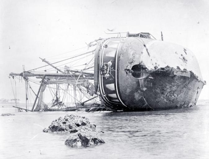 | Keywords: drawing monochrome outdoor NH 42286: German Gunboat Adler. Overturned on the reef, on the western side of Apia Harbor, Upolu, Samoa, soon after the storm. Note her battered hull, well for hoisting propeller, rescue bouy mounted on her stern, and decorative windows painted on her quarters. Naval History and Heritage Command Photograph. (2016/01/03). NH 42286: German Gunboat Adler. Overturned on the reef, on the western side of Apia Harbor, Upolu, Samoa, soon after the storm. Note her battered hull, well for hoisting propeller, rescue bouy mounted on her stern, and decorative windows painted on her quarters. Naval History and Heritage Command Photograph. (2016/01/03). |